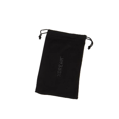 Black microfiber sleeve with drawstring closure, equipped with a large mesh front pocket, perfect for carrying around other accessories.