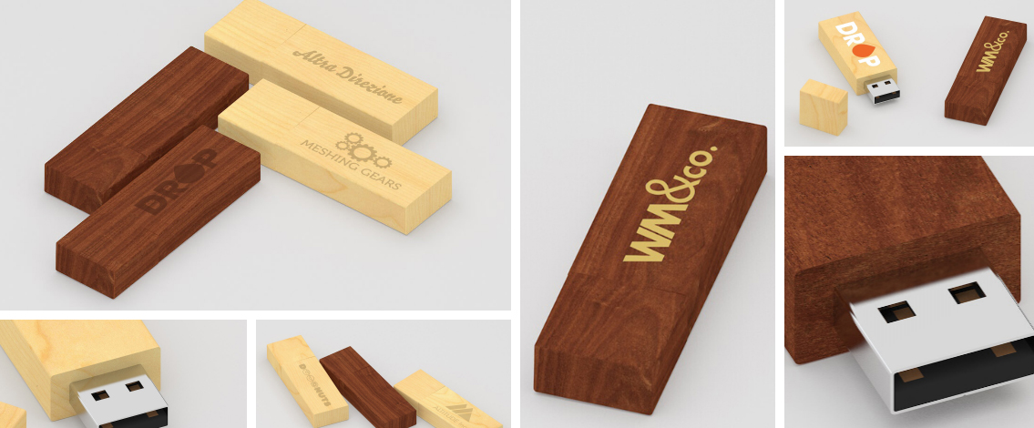 Wooden USB flash drive available in three models: Bamboo, Maple, and Mahogany. It has a standard square shape and is equipped with a removable cap with a magnetic closing system. Its essential design gives the flash drive a minimalist style, which is however softened by the wood. It can be customised on both sides with silk-screen printing or resin relief.