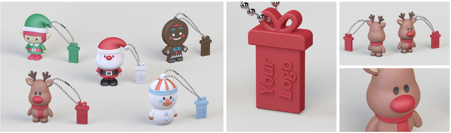 Christmas-bulk-flash-drives! Soft rubber 3D USB flash drive that reproduces the figure of a reindeer. It is equipped with a customizable cap holder with a relief reproduction of your personal logo. It is the ideal gadget or Christmas present. Our minimum order for this style is 50 pieces and you can get them just in 5 working days.