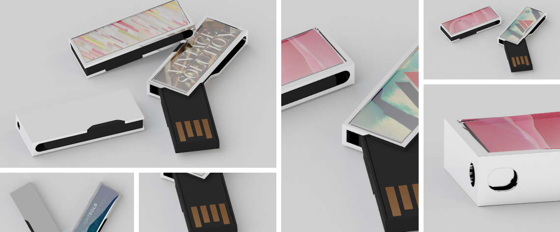 Rectangular-shaped metal USB flash drive. It is ultra slim as a result of the latest generation COB chip used. To open it, rotate the connector to one side. It is equipped with an angular functional slot to apply straps and accessories. The front part is entirely customisable with epoxy resin, and the back can have silk-screen printing or laser engraving.