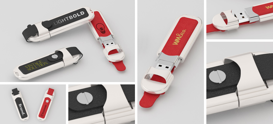 Technological, elegant, imitation leather USB flash drive. It is equipped with a cap support buckle, which, once released, reveals the connector, and has a functional hook at the end to apply straps and accessories. It can be customised with silk-screen printing or resin relief on both sides.