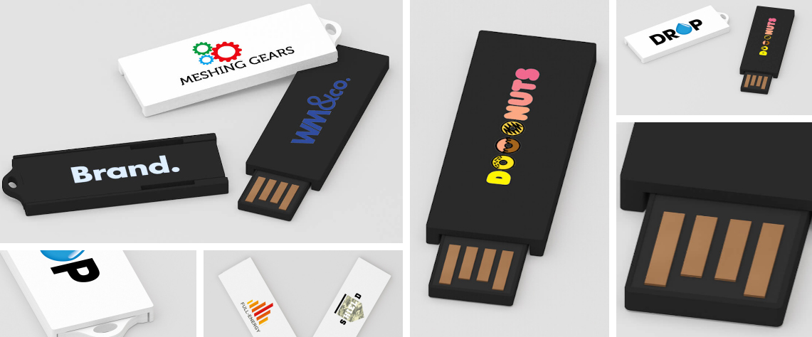 Super slim, plastic USB flash drive. The connector is released by means of a sliding mechanism. This makes the flash drive extremely compact and slim when closed. There is a small functional slot at the end to apply straps and accessories. It can be customised on both sides with silk-screen or CMYK printing.